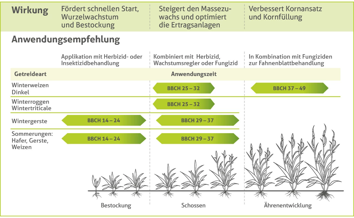 Stärkerer Kornansatz und verbesserte Kornfüllung, höhere Stabilität in Hitze- und Trockenphasen, effizientere N-Nutzung für stärkere Erträge
