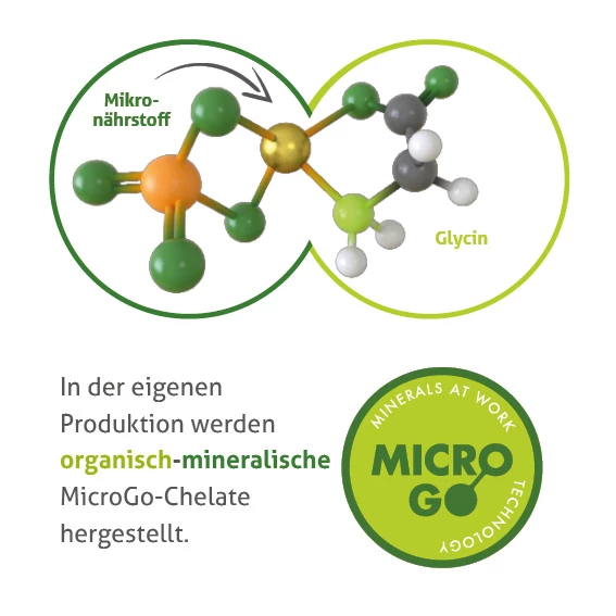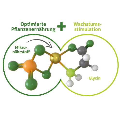Im Zentrum steht die neu entwickelte Wirkstoffklasse auf Basis von Glycinat-Chelaten. Auf einer präzise abgestimmten Nährstoffzusammensetzung sowie auf der chemischen Struktur der enthaltenen Nährstoffe basiert die Wirkung und Anwendungseffizienz unserer Produkte.